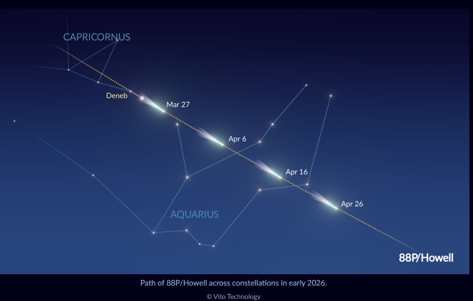 O cometa 88P/Howell é um dos cometas mais tranquilos de 2026, visível em latitudes sul de meados de fevereiro até o final de abril. Ele atingiu seu brilho máximo por volta do periélio em 18 de março de 2026, quando se tornou um bom alvo para observação telescópica. Em abril, ele ainda deverá ser observável por telescópios para observadores do céu no Hemisfério Sul.