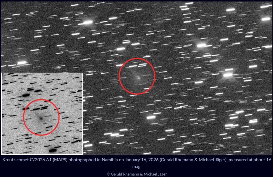 O C/2026 A1 (MAPS) já é visível com binóculos ou um pequeno telescópio e continua a brilhar cada vez mais. No entanto, no início de abril, será muito mais difícil observá-lo, à medida que se aproxima do Sol e mergulha no crepúsculo. O momento crucial será em 4 de abril de 2026, quando o cometa passará muito perto do Sol.